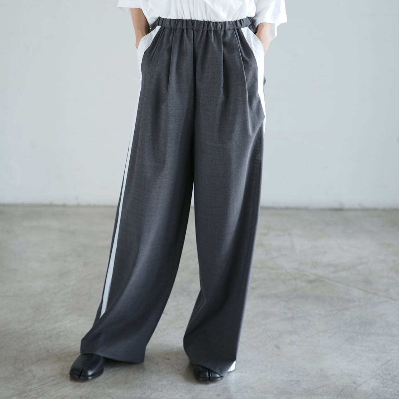両脇にシャツ地を切り替えて、2種類のパンツを履いているかのようなドッキングアイテム。