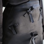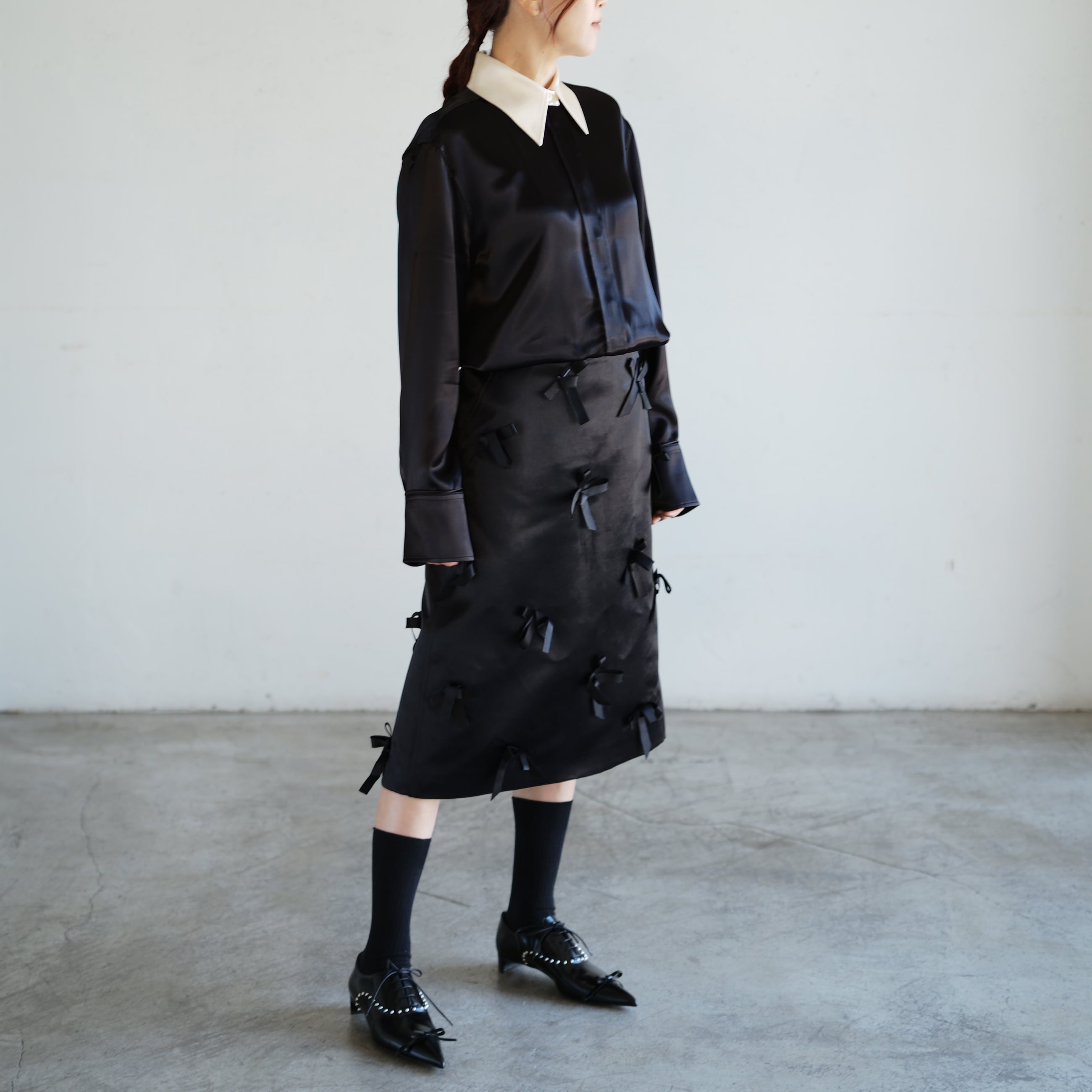 KNEE LENGHT STRAIGHT FIT SKIRT WITH ALL OVER ORIGAMI BOW EMBROIDERY. INVISIBLE ZIP CLOSURE AND CENTER BACK SLIT