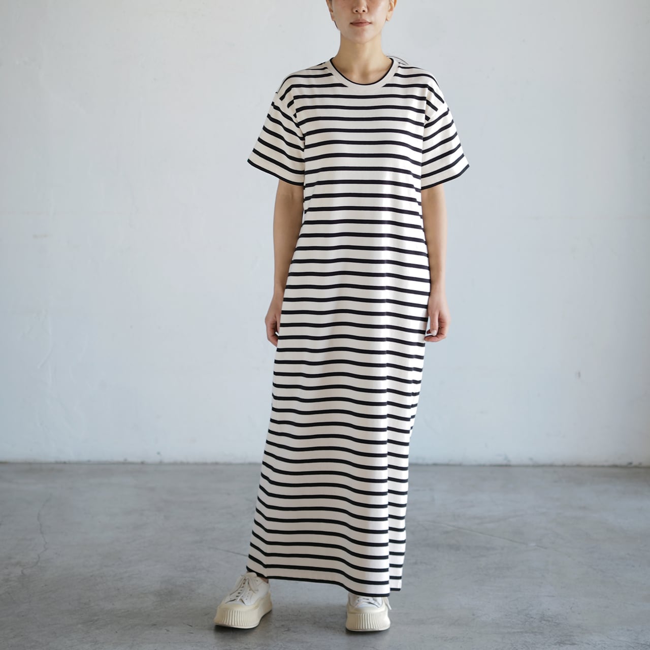 SHORT SLEEVES CREW NECK LONG DRESS WITH LOGO LABEL TOP-STITCHED AT THE BACK